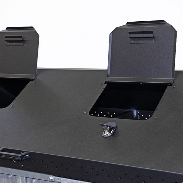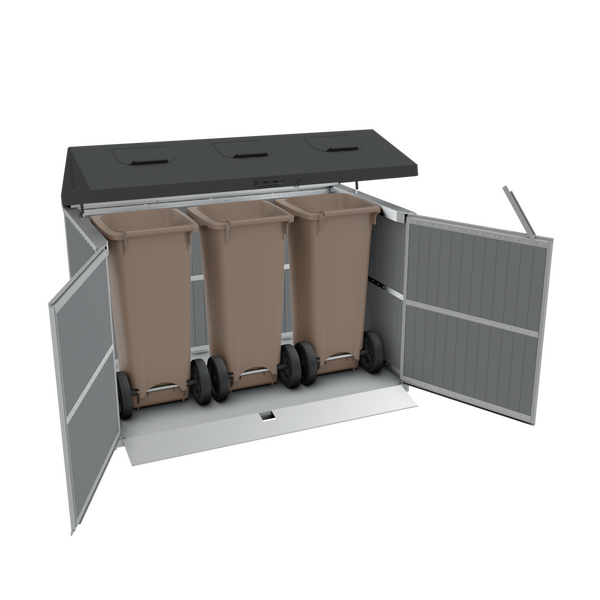 Det rymliga kärlskåpet Taberg erbjuder stor flexibilitet kring upplägg av fraktioner. Den lackerade toppen har inkastluckor som kan utrustas med lås. Gavlarna har en dekorativ perforering för effektivare ventilation och reducering av lukt. Taberg är ett flexibelt system för både stor och liten skala och passar utmärkt vid både flerfamiljshuset och på offentliga platser som torg och lekparker.