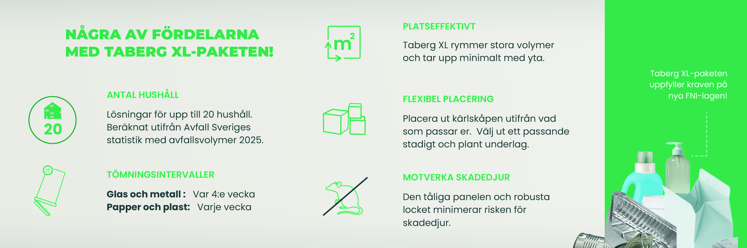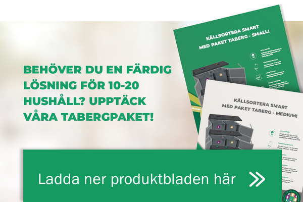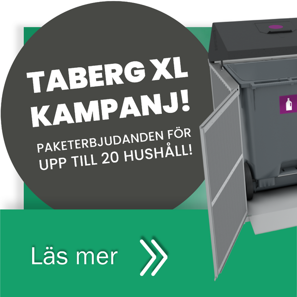 Du har väl inte missat vara praktiska Tabergpaket? Med rymliga Taberg får du möjlighet till effektiv och flexibel fastighetsnära insamling. Våra paket finns i storlek small (10 hushåll) samt storlek medium (för 20 hushåll). Passa på att upptäcka Taberg till ett förmånligt pris.