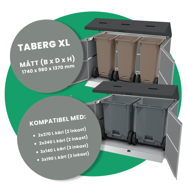 Den större Tabergmodellen erbjuder möjligheten till 2 eller 3 inkast. Taberg XL med 2 inkast rymmer 370 eller 240 L kärl. Modellen med 3 inkast kan utrustas med 140 eller 190 L kärl.